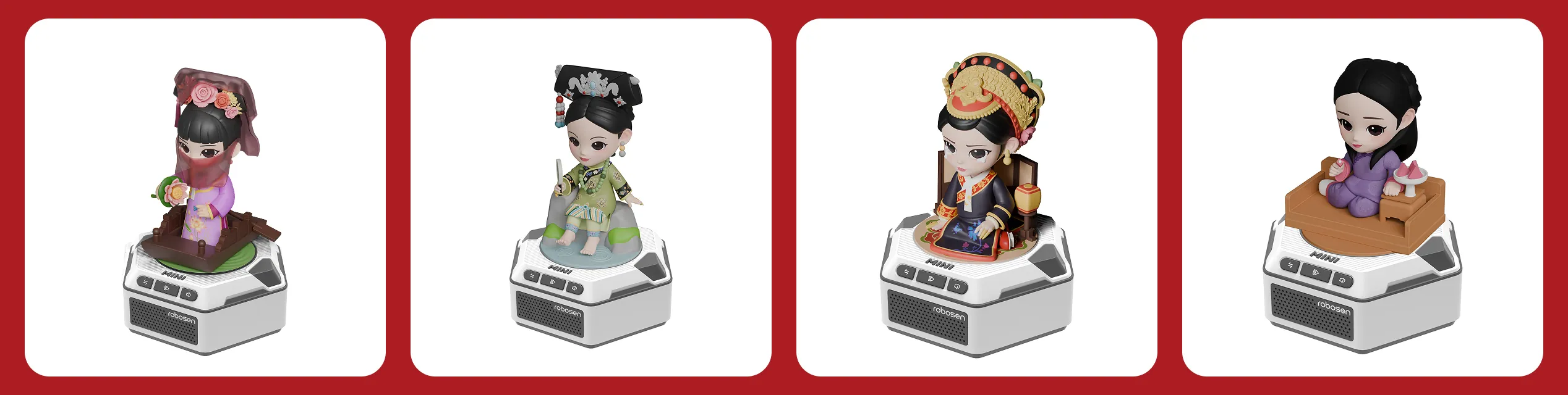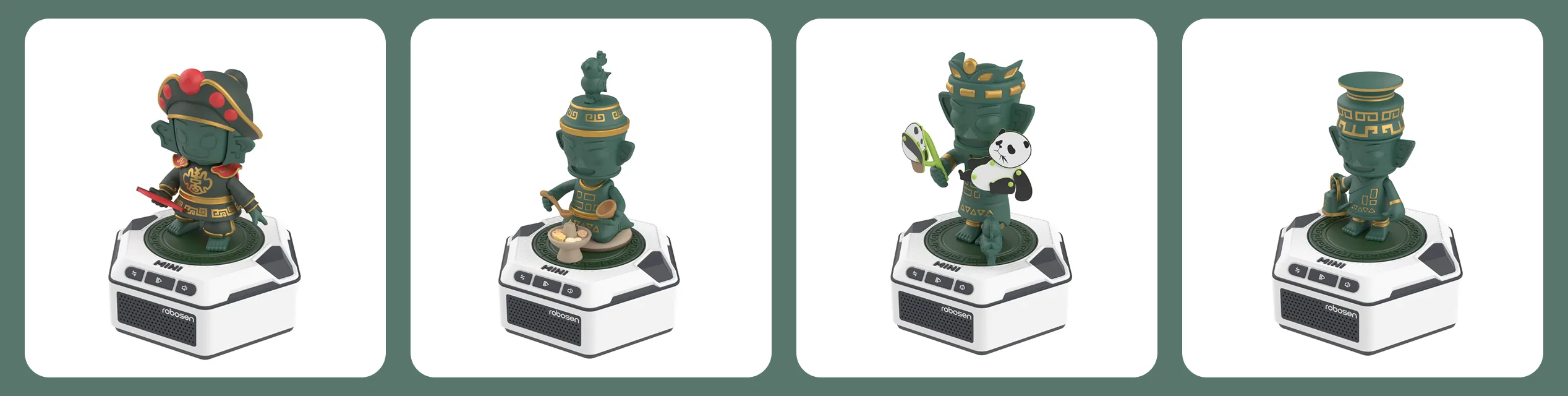 公仔与通用底座支持自由拆卸及组合。用户可购买各款式的“迷你机器人”,都能兼容在同一个底座上运行。