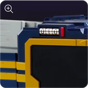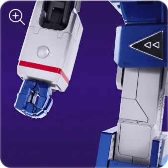 机器人形态以深蓝为主色,搭配灰色、银色机械部件,每一处关节都隐藏精密设计——头部尖刺状装饰复刻声波经典造型,眼部红光随交互闪烁如扫描信号,手臂机械纹路与电影级涂装工艺结合,从正面、侧面到背面,360°无死角展现塞伯坦战士的硬核美感。